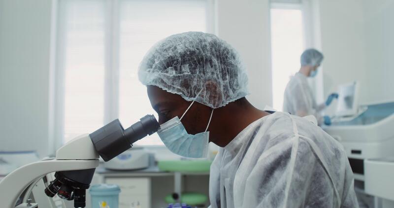 Close-up of the face of a laboratory assistant in a medical mask and disposable cap, looking through a microscope while checking blood, working as a team. 4k, red komodo Pro Video