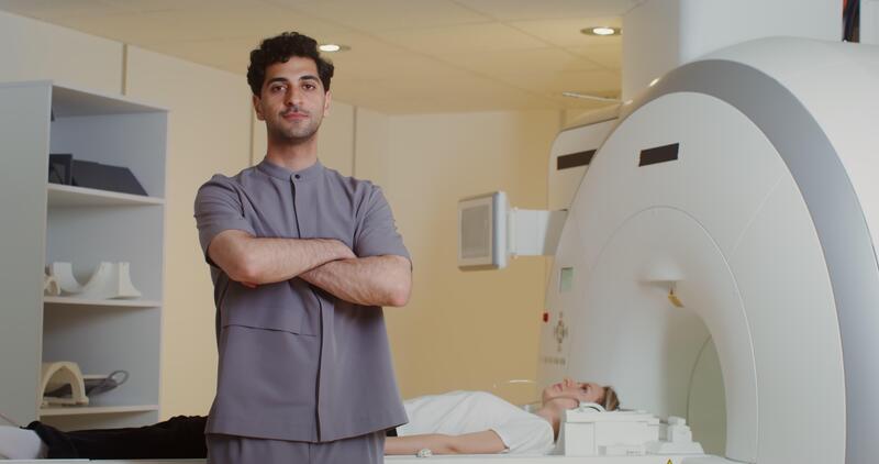 A curly-haired doctor with stubble on his face looks into the camera with his arms crossed over his chest, standing in front of a CT scan machine with a patient lying on it. in 4k, red komodo Pro Video