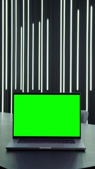 Young businesswoman uses a tablet while walking near the desktop with an open laptop with a green screen standing on it, vertical . Chroma key, mockup, copy space. in 4k format, red komodo. Pro Video