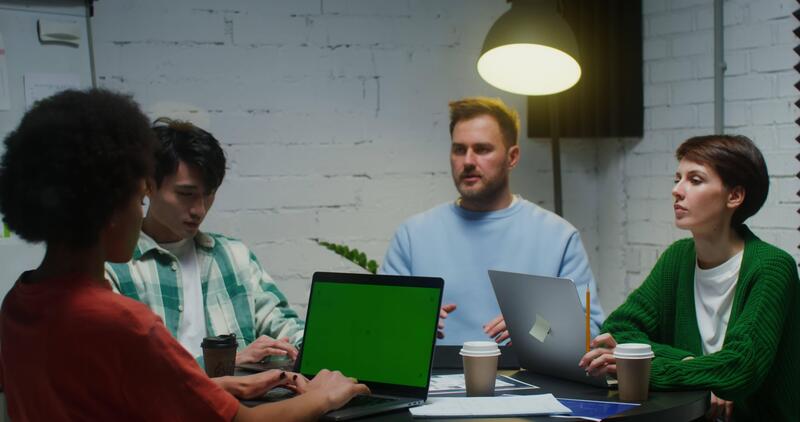 A group of young entrepreneurs of various nationalities are focused on creating a business plan for a startup, working on laptops with a green screen. Chroma key, copy space Pro Video