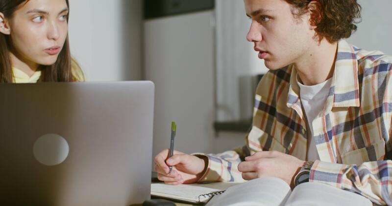 Young students work in pairs, using a laptop and making notes in a notebook while sitting at the table in the kitchen. Online training, teamwork on a project Pro Video