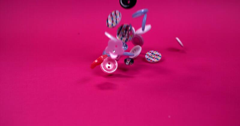 Multi-colored buttons of different shapes fall on a pink background, in slow motion Pro Video