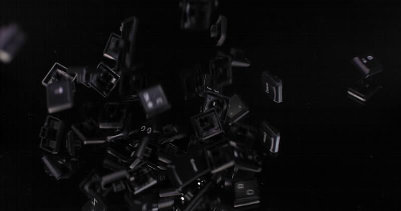 A lot of computer keys from a keyboard with latin letters and numbers falling down, slow motion on a black background Pro Video