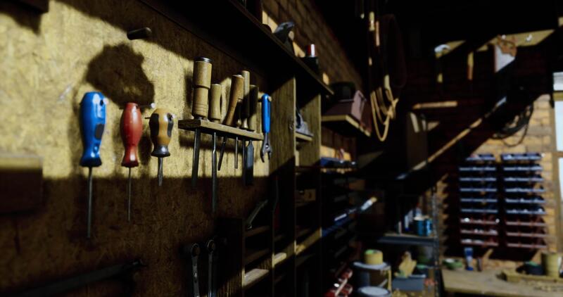 Workshop tools organized on a wooden wall in a rustic setting Pro Video