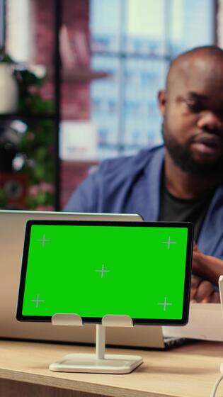 African American couple browse troubleshooting guide next to chroma key, working together to debug router issues and restore their home network. Freelancers getting angry. Camera B. Pro Video