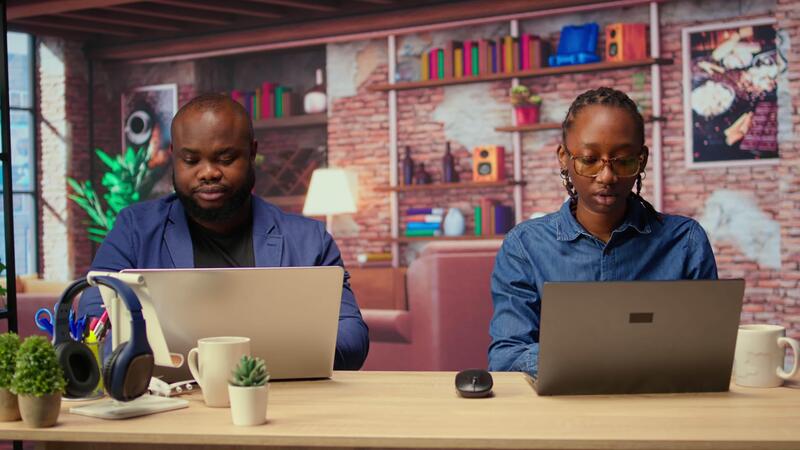 African American couple at their home office collaborate on a project, using teamwork and digital online tools to enhance efficiency and career growth. Solving freelancing tasks. Camera A. Pro Video