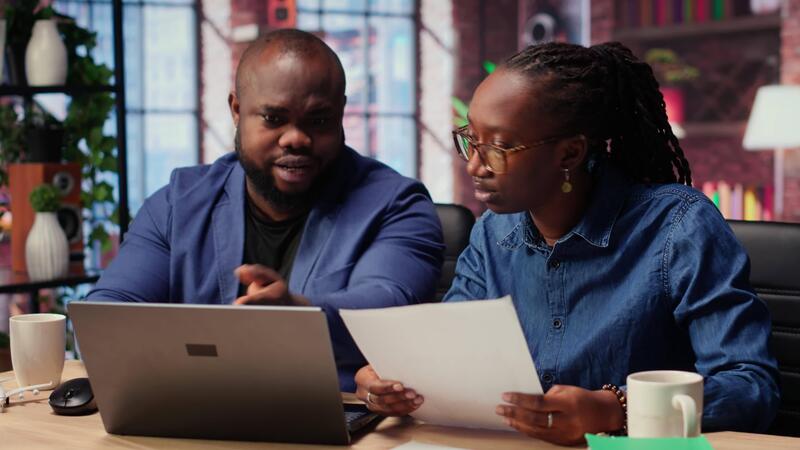 Black people both working from home at their designated office, using online tools on computer for tasks management. Completing operations efficiently from their comfortable house. Camera B. Pro Video