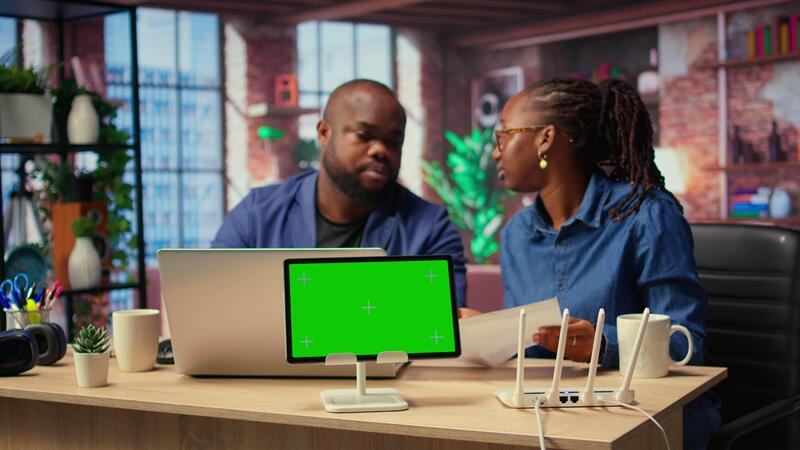 African American couple browse troubleshooting guide next to chroma key, working together to debug router issues and restore their home network. Freelancers getting angry. Camera A. Pro Video