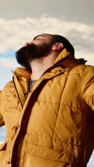 Vertical Joyful hiker triumphant at the mountain top dancing and cheering, soaks in the peaceful atmosphere and fresh air. Enjoying the scenic background of towering peaks and clouds. Camera B. Pro Video