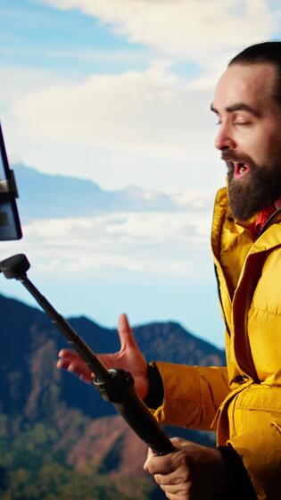 Vertical Vlogger recording a with a smartphone on a tripod capturing a panoramic view of the mountains from a rocky peak. Content creator shares his passion for travel and nature. Camera A. Pro Video