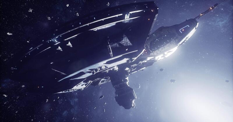 Spaceship navigating asteroid field in deep space with a bright star Pro Video