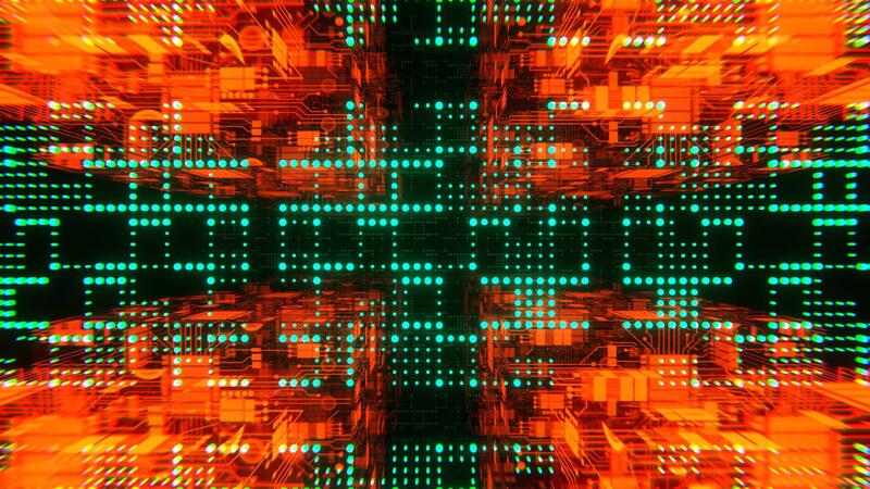 Turquoise and Deep Orange Cybernetic Chip Cube and Dots Flythrough Background VJ Loop I 4K Pro Video