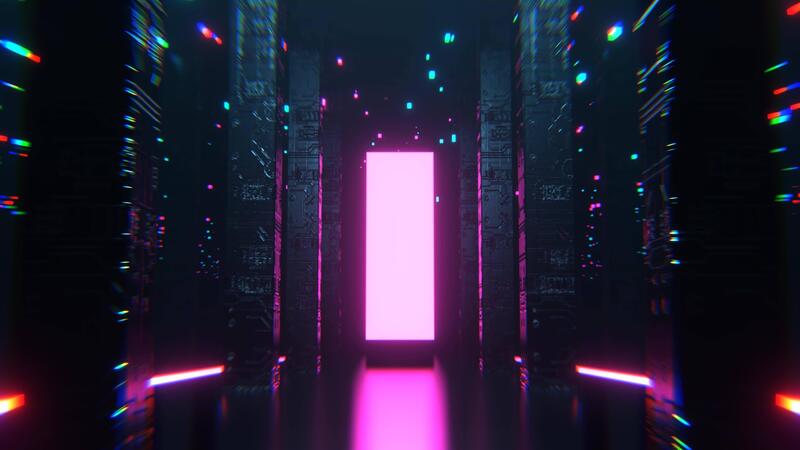 Cyan and Pink Neon Sci Fi Hall with Tall Columns and Portal Background VJ Loop I 4K Pro Video