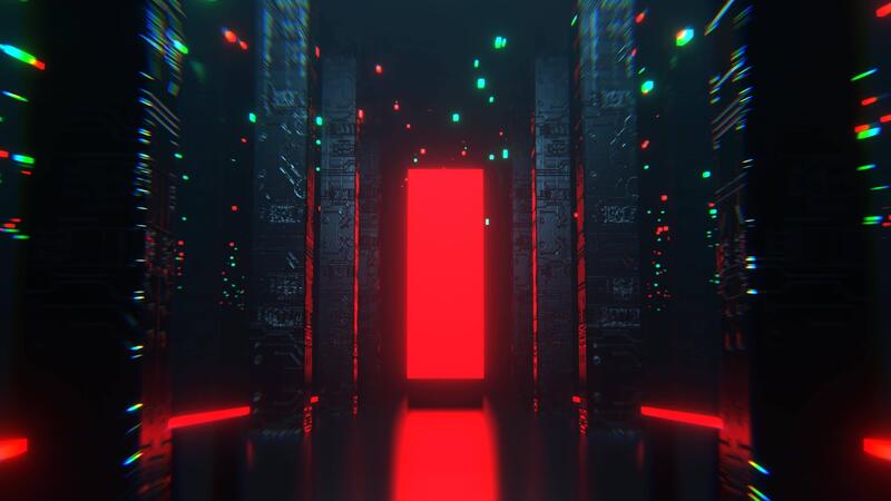 Turquoise and Red Neon Sci Fi Hall with Tall Columns and Portal Background VJ Loop I 4K Free Video