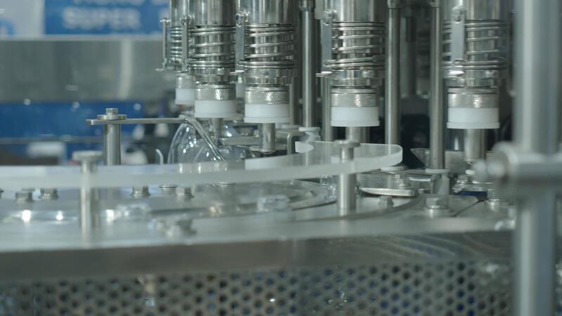 Close up view of a plastic bottle production line in a factory. Parts of transparent PET bottles move along an automated conveyor system. Showing modern PET drinking bottles manufacturing automation. Pro Video