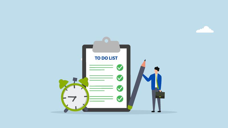 To do list, 4k animation of efficient entrepreneur with notepad and task list clipboard accompanied by timer. Pro Video