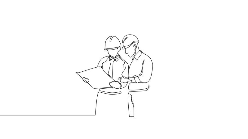 Hand Drawn One Line Contractor Animation .Minimalist Line Art .Continuous Outline Drawing Two Young Architect Explaining Building Design Blueprint to Contractor .Business Concept. Pro Video