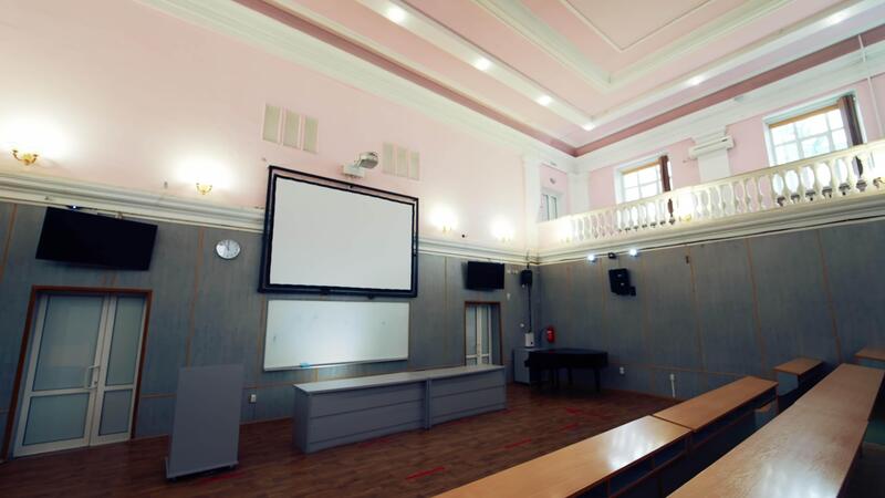University classroom interior empty. Empty large lecture room of university classroom Pro Video
