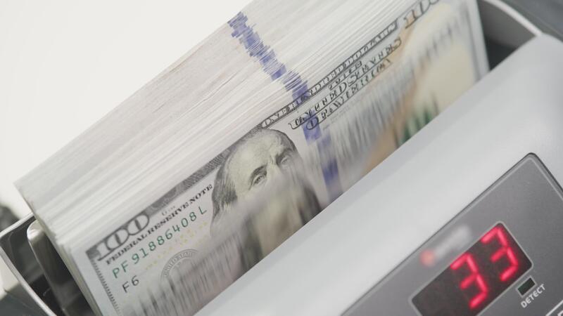 Stack of US Dollar Bills in Money Counting Machine with Digital Display Pro Video