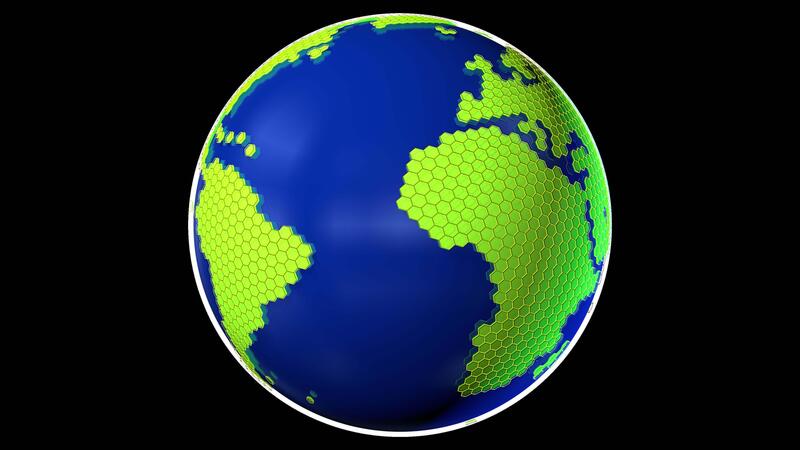 Stylized planet Earth with continents formed by green hexagons on a bright blue sphere rotating 360 degrees against a background with alpha channel. Loop sequence. 3D Animation Free Video