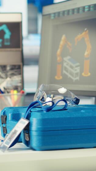 Vertical Toolbox on desk in empty photovoltaics factory and PC used for analyzing data and reviewing system metrics. Toolbox in solar panels manufacturing plant used for repairing technical issues faults Pro Video