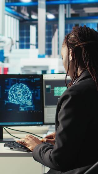 Vertical Photovoltaics factory programmer analyzing data using artificial intelligence, reviewing system metrics. Solar panels plant technician troubleshooting technical issues using AI technology, camera A Pro Video