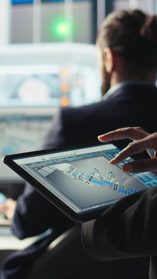 Vertical Photovoltaics factory specialist designs production lines in CAD app using tablet. Solar panels plant technician uses simulation software on device to optimize production layouts, camera A closeup Pro Video