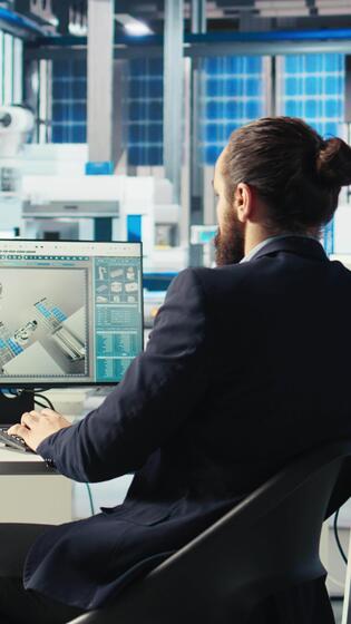 Vertical Photovoltaics factory engineer drinking coffee analyzing data, reviewing system metrics. Solar panels plant technician enjoying beverage troubleshooting technical issues using computer Pro Video