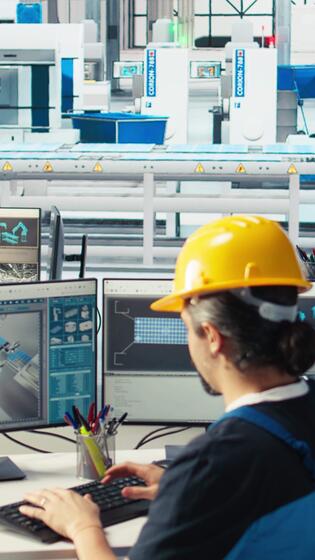Vertical Manager instructs solar panels plant employee on how to use CAD software to optimize layouts. Photovoltaics factory supervisor teaches worker how to do arrangements for maximum energy output, camera A Pro Video