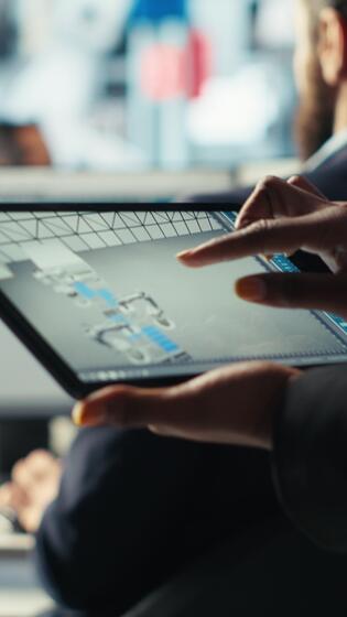 Vertical Solar panels plant employee uses CAD software on tablet to optimize layouts. Photovoltaics factory worker doing arrangements for maximum energy output using device, camera B close up Pro Video