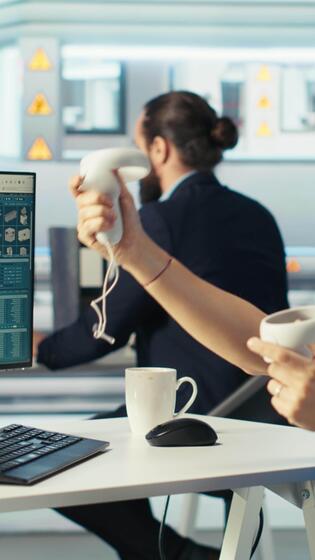 Vertical Photovoltaics factory technician using VR headset to adjust system parameters, maximizing power generation. Man using virtual reality tech, optimizing energy supply in solar panel plant, camera B Pro Video