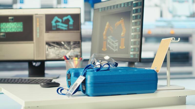 Toolbox on desk in empty photovoltaics factory and PC used for analyzing data and reviewing system metrics. Toolbox in solar panels manufacturing plant used for repairing technical issues faults Pro Video