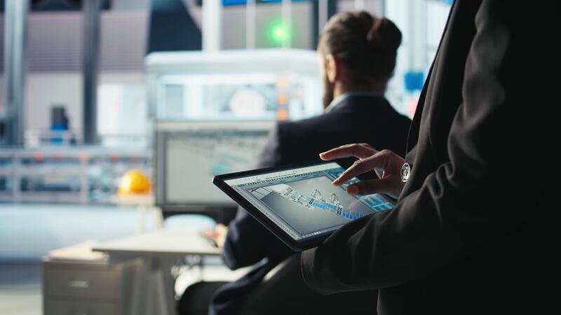Photovoltaics factory specialist designs production lines in CAD app using tablet. Solar panels plant technician uses simulation software on device to optimize production layouts, camera A closeup Pro Video
