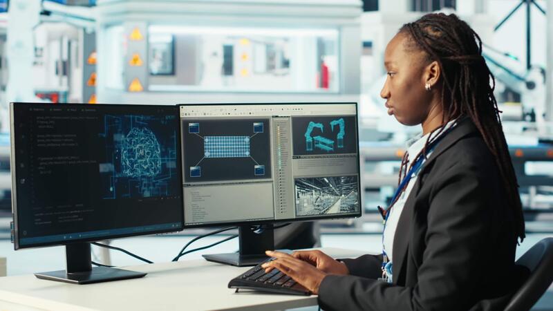 Photovoltaics factory programmer using AI technology to monitor system performance. Solar panels manufacturing plant developer using artificial intelligence to track energy production, camera B Pro Video