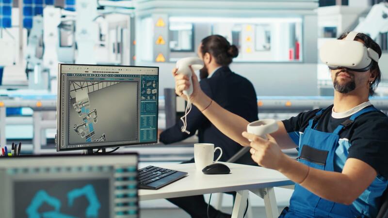 Photovoltaics factory technician using VR headset to adjust system parameters, maximizing power generation. Man using virtual reality tech, optimizing energy supply in solar panel plant, camera B Pro Video