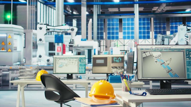CAD program on PC screen in photovoltaics factory used for designing production lines for solar panel assembly facility. Simulation software on computer monitor in empty solar panels plant Pro Video