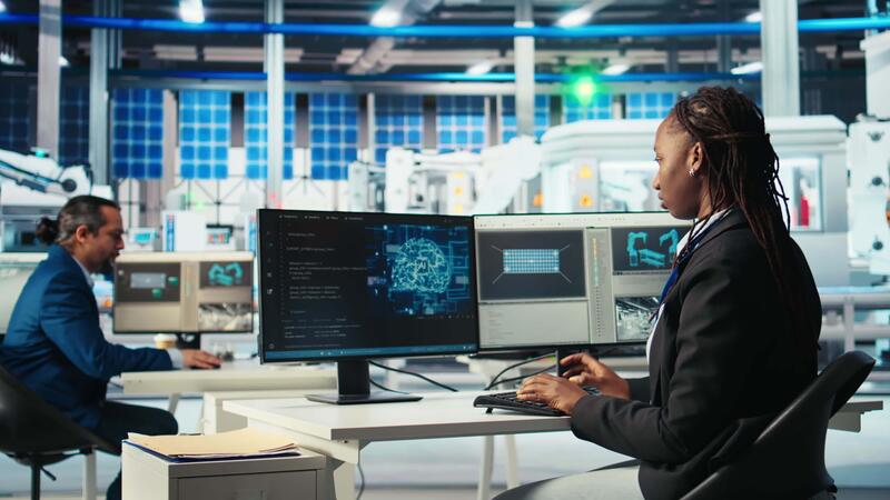 Photovoltaics factory programmer using AI technology to monitor system performance. Solar panels manufacturing plant developer using artificial intelligence to track energy production, camera A Pro Video