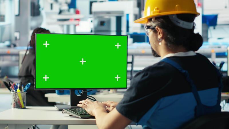 Photovoltaics factory engineer using green screen PC to adjust system parameters. Technician optimizing energy supply in solar panel manufacturing plant using chroma key computer, camera B Pro Video