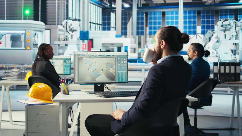 Photovoltaics factory engineer drinking coffee analyzing data, reviewing system metrics. Solar panels plant technician enjoying beverage troubleshooting technical issues using computer Pro Video
