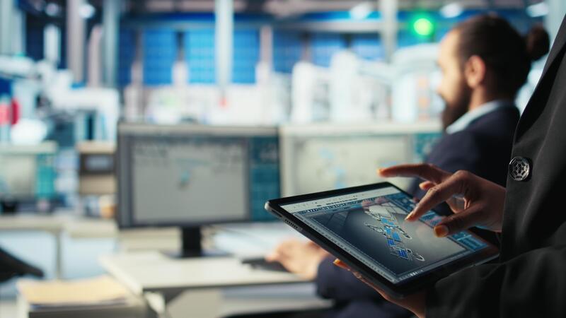 Solar panels plant employee uses CAD software on tablet to optimize layouts. Photovoltaics factory worker doing arrangements for maximum energy output using device, camera A close up Pro Video
