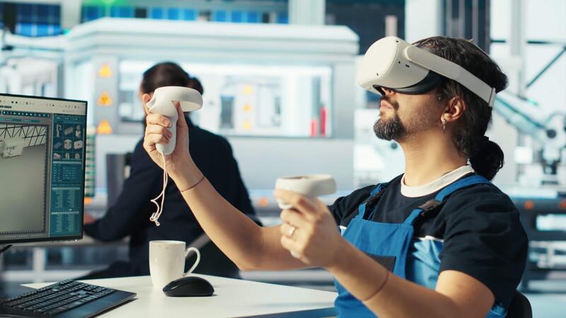 Photovoltaics factory engineer analyzing data using VR headset, reviewing system health. Solar panels plant employee troubleshooting issues using virtual reality tech, diagnosing faults, camera B Pro Video