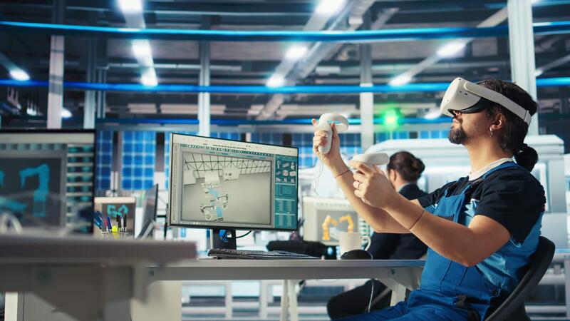 Photovoltaics factory engineer analyzing data using VR headset, reviewing system health. Solar panels plant employee troubleshooting issues using virtual reality tech, diagnosing faults, camera A Pro Video
