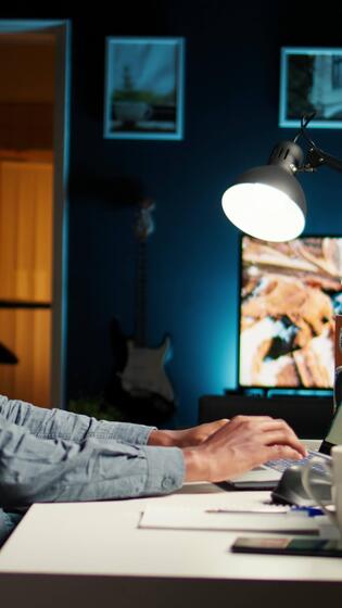 Vertical African American freelancer researching data driven topics at his home workstation, planning work schedule and completing project tasks. Managing job from a comfortable setup. Camera A. Pro Video
