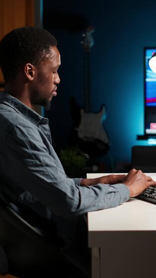 Vertical Young programmer engineer writing binary code data on terminal window, doing freelance work at home setup. Software developer working on troubleshooting with programming language. Camera B. Pro Video