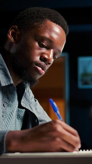Vertical Remote worker in a cozy apartment organizing data and writing articles, checking online information. Focused on self improvement, planning work activities and handling tasks efficiently. Camera A. Pro Video
