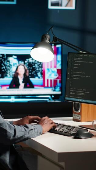 Vertical African american expert at desk using pc for programming and data analysis. Young networking expert working from his home setup, manages information technology and data center. Camera B. Pro Video