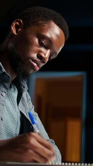 Vertical Focused self employed adult researching data driven topics at home, writing handwritten notes and solving tasks in his remote work setup. Managing projects from a stylish apartment. Camera A. Pro Video