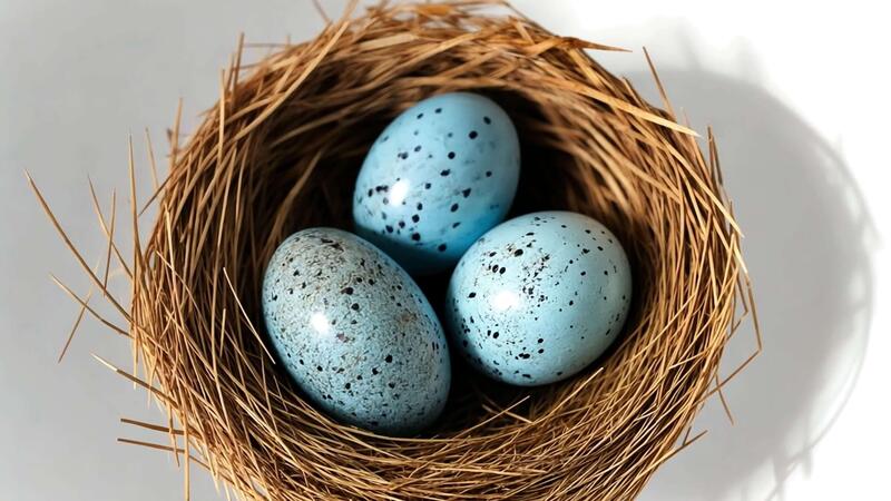Three blue speckled eggs are nestled gently in a straw nest, illuminated by soft natural light on a clear surface, creating a tranquil and serene atmosphere. Pro Video