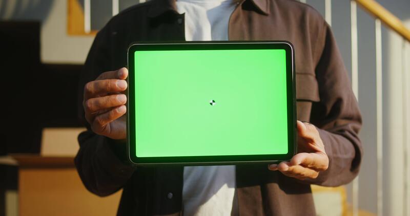 A man of European appearance holds a tablet with a green screen in his hands, against the background of boxes while moving to a new house, close-up. Copy space, mock up Pro Video