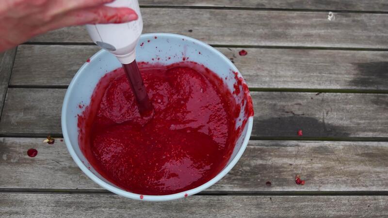 Raspberry sauce preparation involves blending raspberries into a smooth puree using an immersion blender in a bowl, creating a vibrant and flavorful culinary base Pro Video